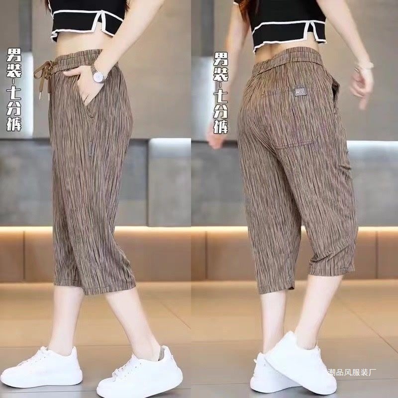 2025新型流れ星ストライプ男性アイスパンツ夏の薄い通気性カジュアル高弾七分ズボン