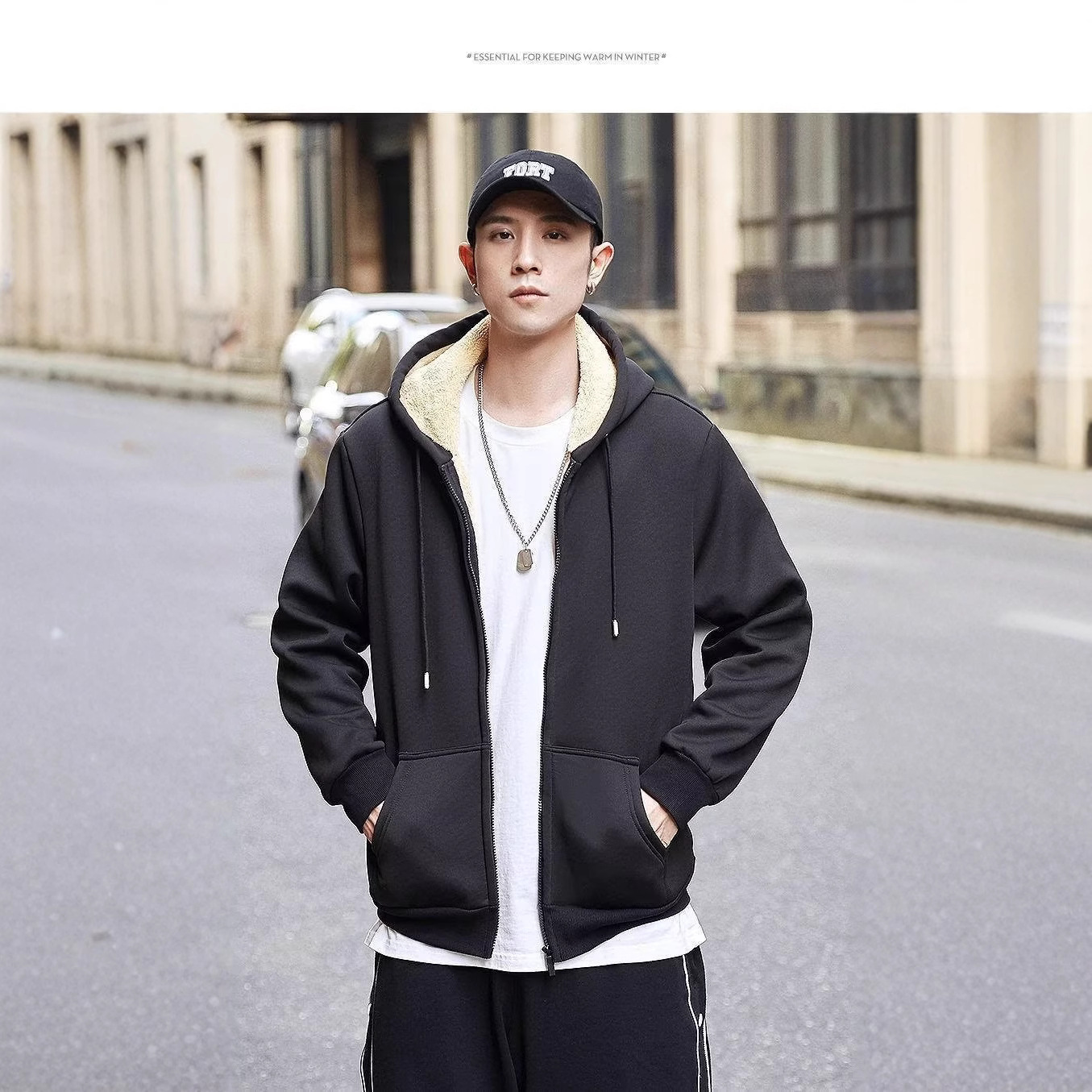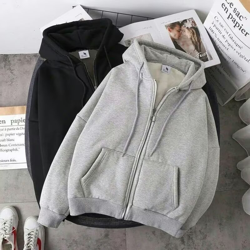子羊の毛の春秋のモデルの衛衣の男性の秋冬のベルベットの厚い中で青年のファスナーのゆったりしている帽子のレジャーのスポーツの上着