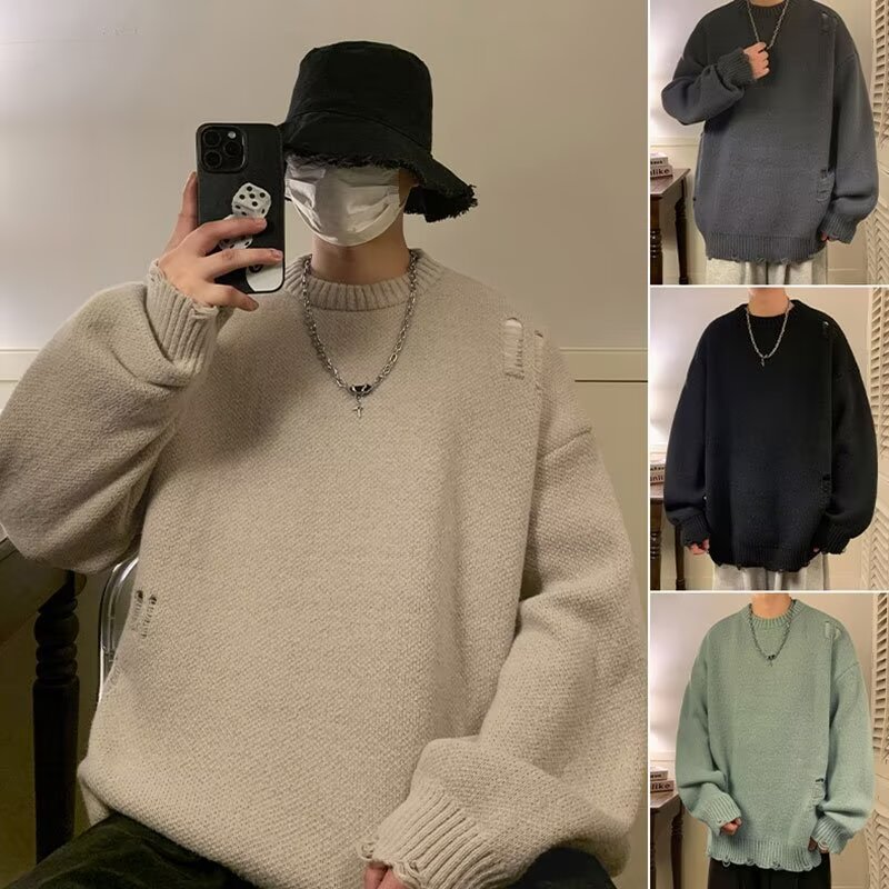 穴を割ったセーターの男性は冬に怠惰な高級感を増して保温ニットの秋冬スタイルのアメリカのレトロな日系コートを厚くした