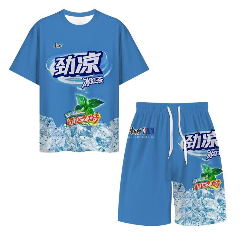 源メーカープリント夏ファッション半袖tシャツセット男性夏t速乾ゆるいバスケットボールスポーツ2点セット