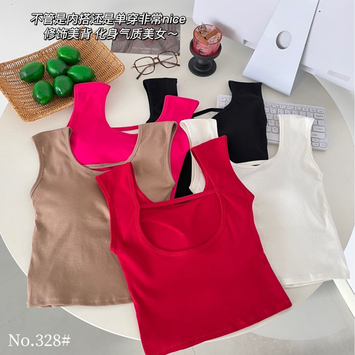 328 # おしゃれで痩せやすい肩ベスト大U透かし彫り固定カップ美背セクシー小飛袖赤露背tシャツ女