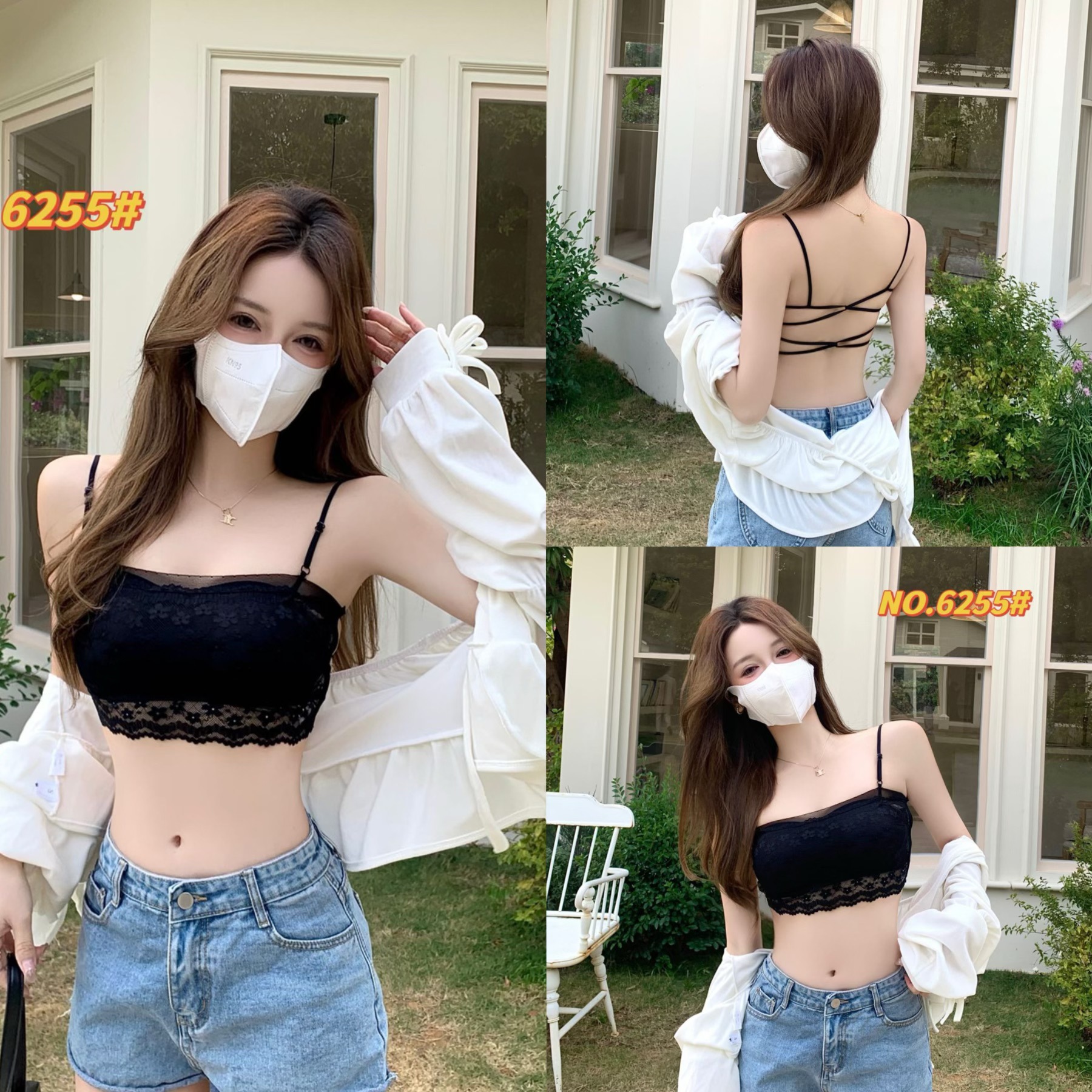 6255 # フランス風セクシーレースクロス透かし彫り美背抹胸女子学生春夏内に固定胸パッド