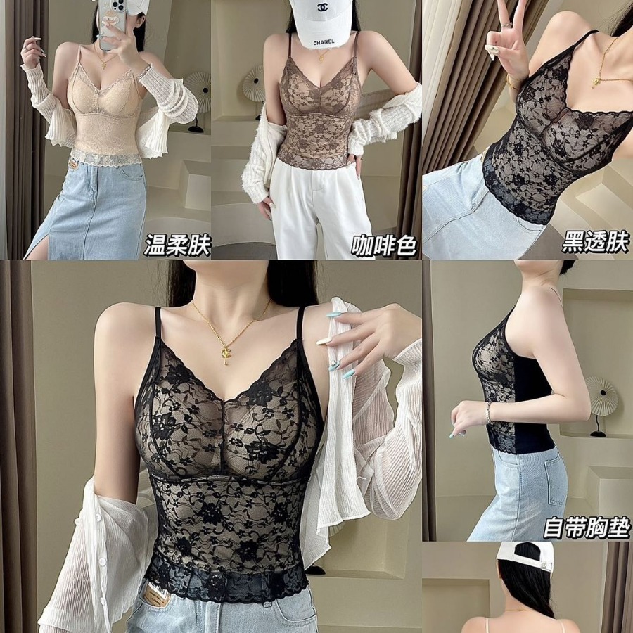 セクシーな透肉vネックの波の縁のレースのベスト春夏の外は胸のパッドの優しくて甘いレースの底の上着を着ます。