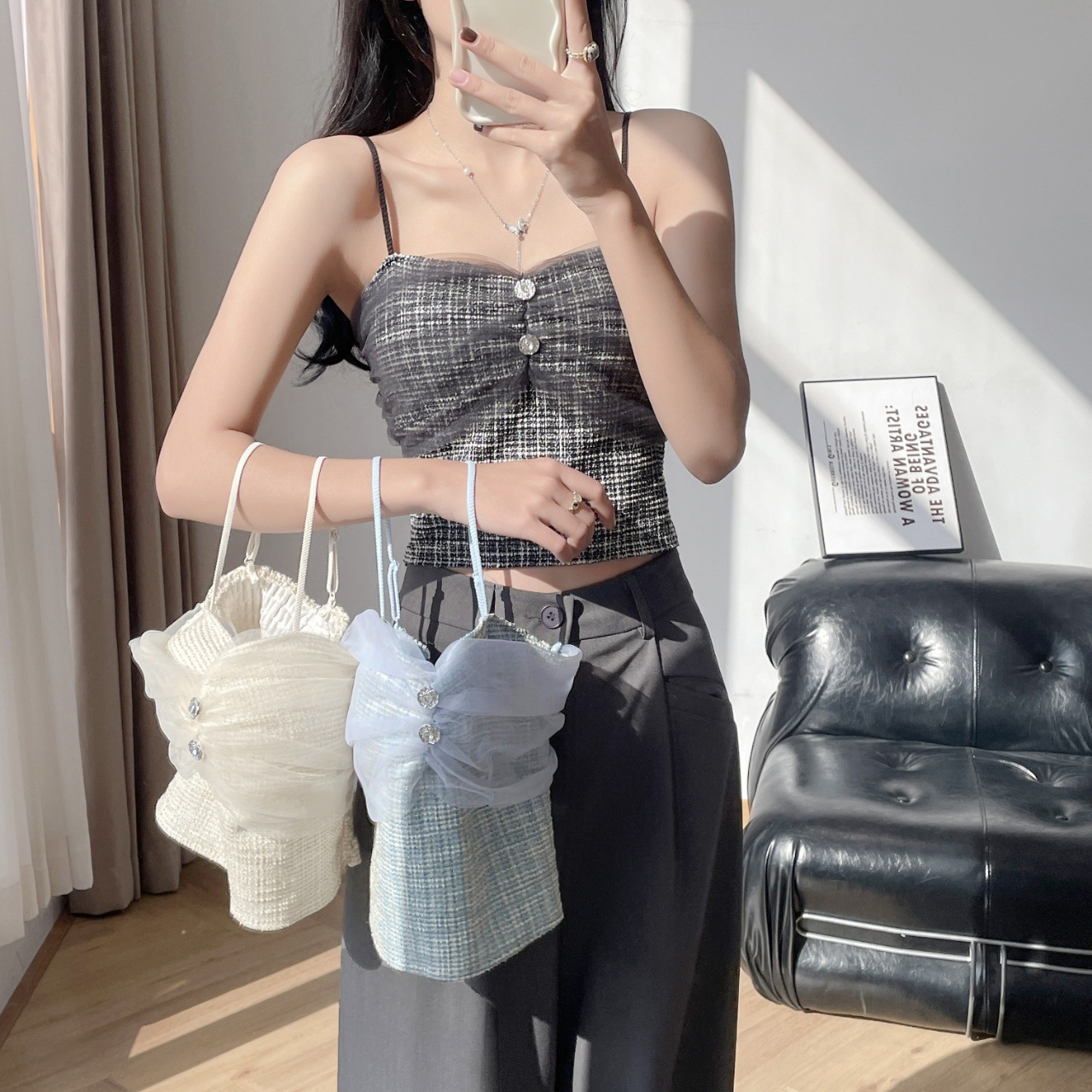 2025春夏の新型気質名媛風網紗しわドリル小ストラップベスト女性ファッション外着胸パッド