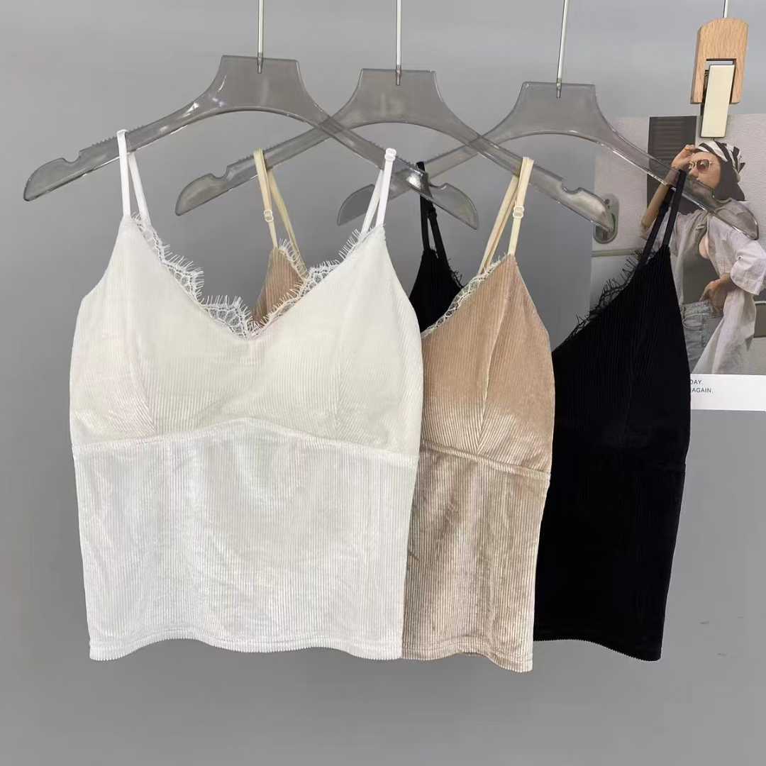 Vネックのまつげのレースの金のベルベットの小さいサスペンダーのベストの秋の中で組み合わせて見せます。