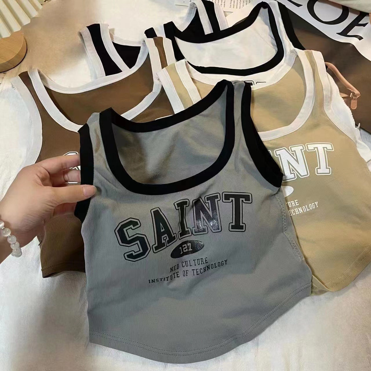 胸パッド付きのカラープリント文字丸首ノースリーブストラップベスト