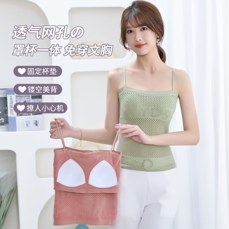 クロスボーダー新型固定カップ下着女性春夏セクシー透かし網穴一字襟ストラップ美背ロングベスト女性