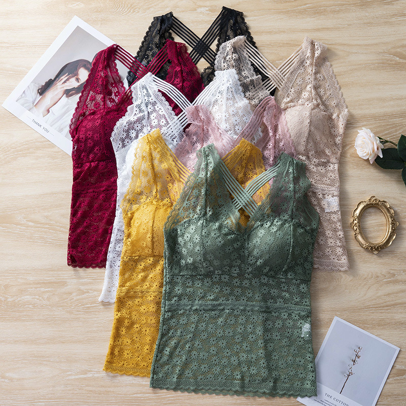 小さいデイジーの全レースの長いタイプのベストの深いvネックのセクシーな交差の美背の広い肩の透視は胸のパッドの下着を持ちます。