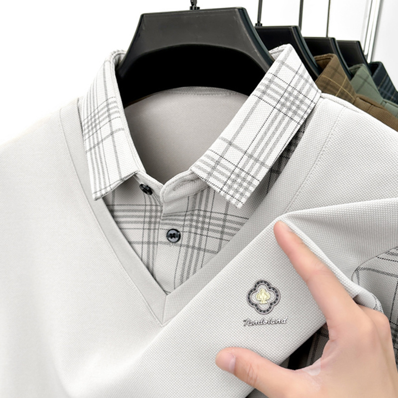 2025春秋新型長袖tシャツ男性偽二枚カジュアル格子シャツ中年お父さん襟上着