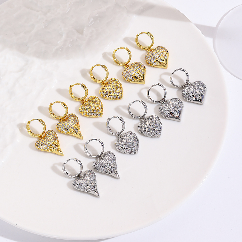 クロスボーダーハイエンドラブイヤリング女性用、銅メッキ18K、ジルコンがちりばめられた誇張されたピーチハートペンダントイヤリング、イヤリング