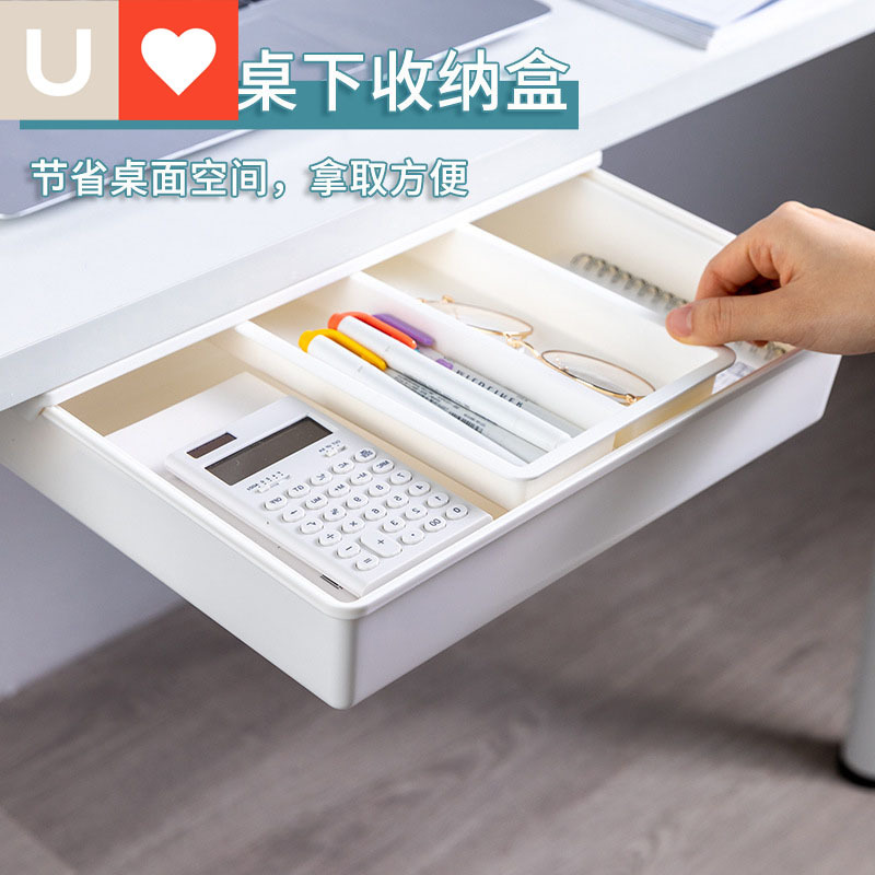 友耐プラスチック事務机の下にある物置棚は文房具ファイルを移動できます。