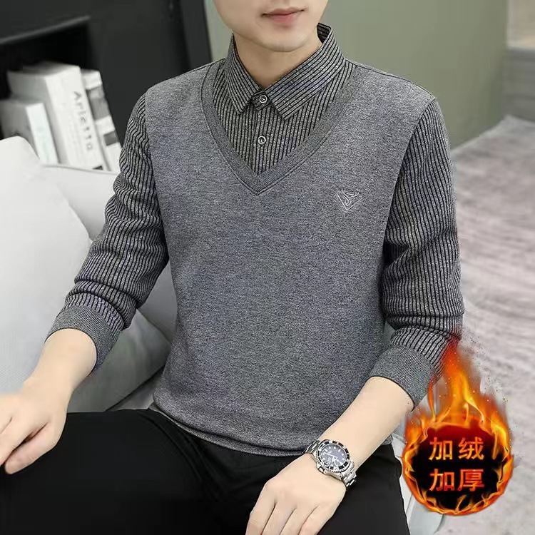 クロスボーダーの新型秋冬男性ポロシャツ長袖厚手偽2枚コート青年男性プルオーバーニット