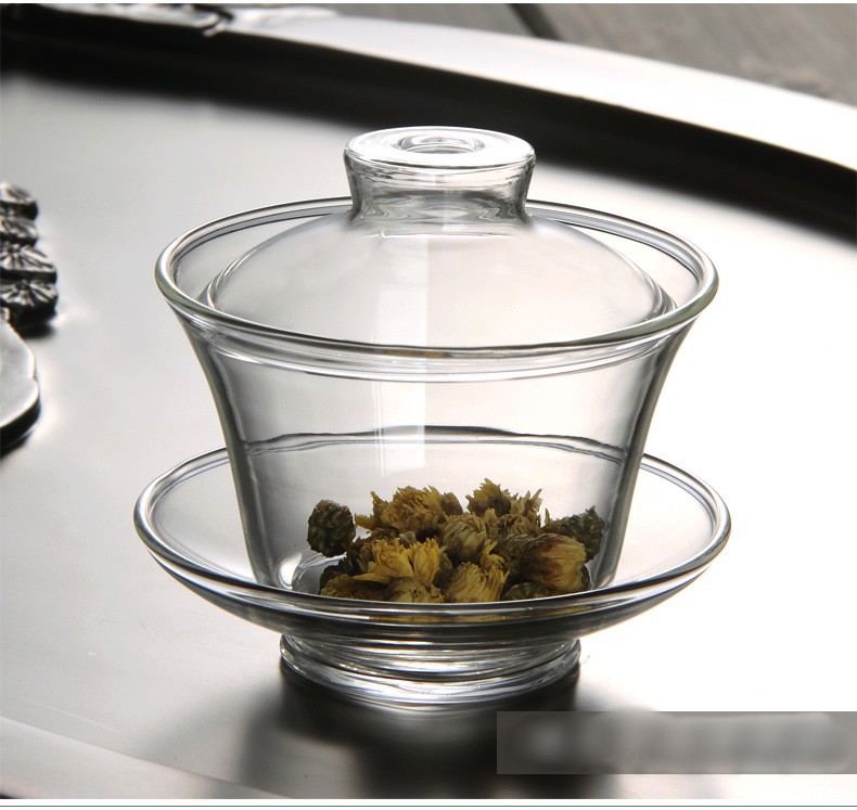 ガラスの蓋と碗の耐熱ガラスの透明な三才の碗はお茶を入れます。