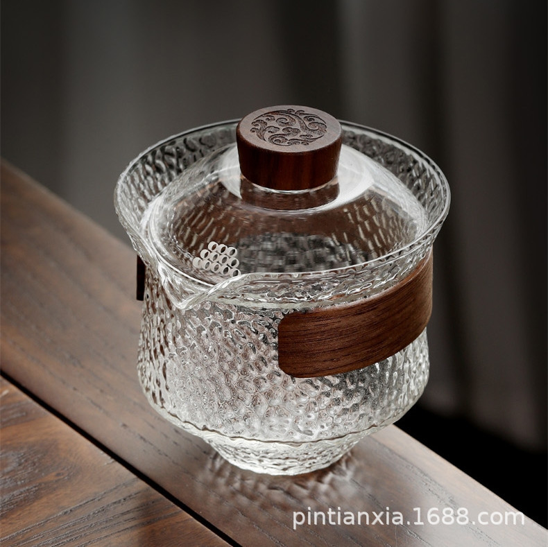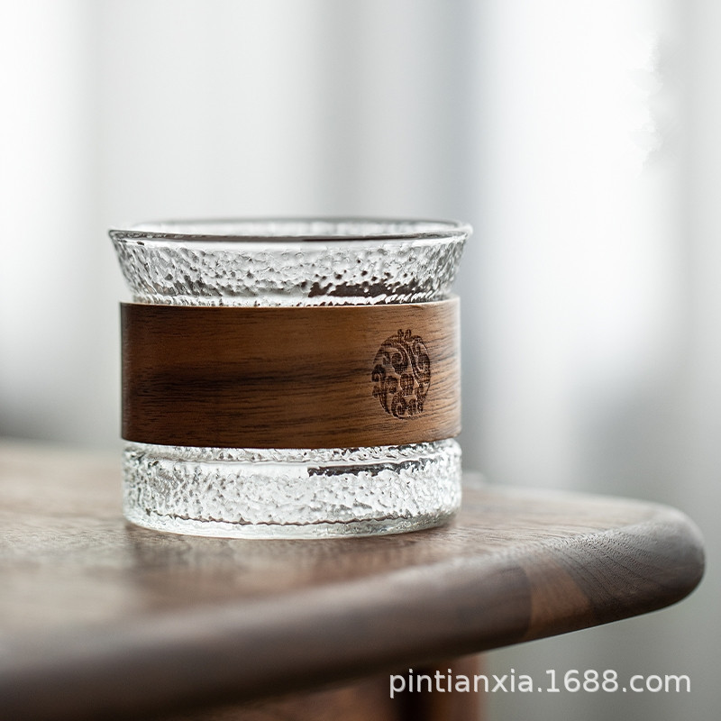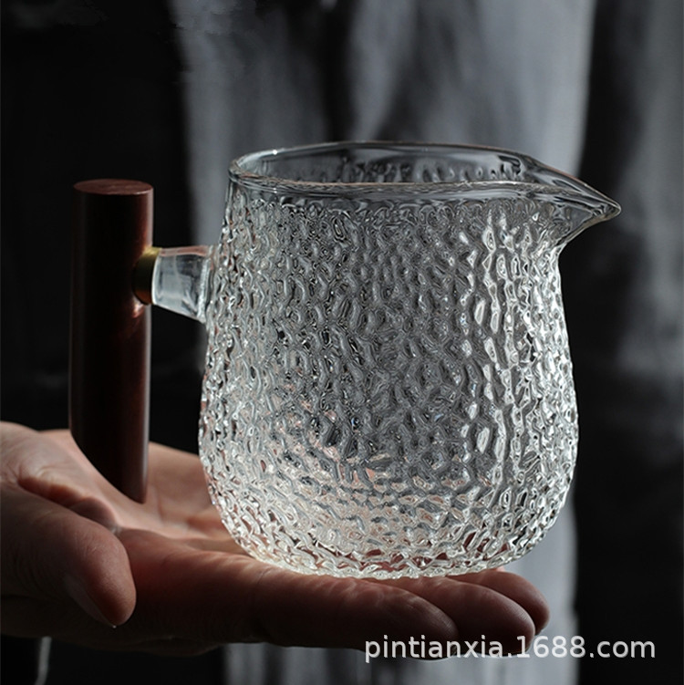 日本式の公道の杯の耐熱のガラスのハンマーの紋様の木は厚く分けて茶器の家庭用の持ち手のお茶の海の工夫の茶器を分けます