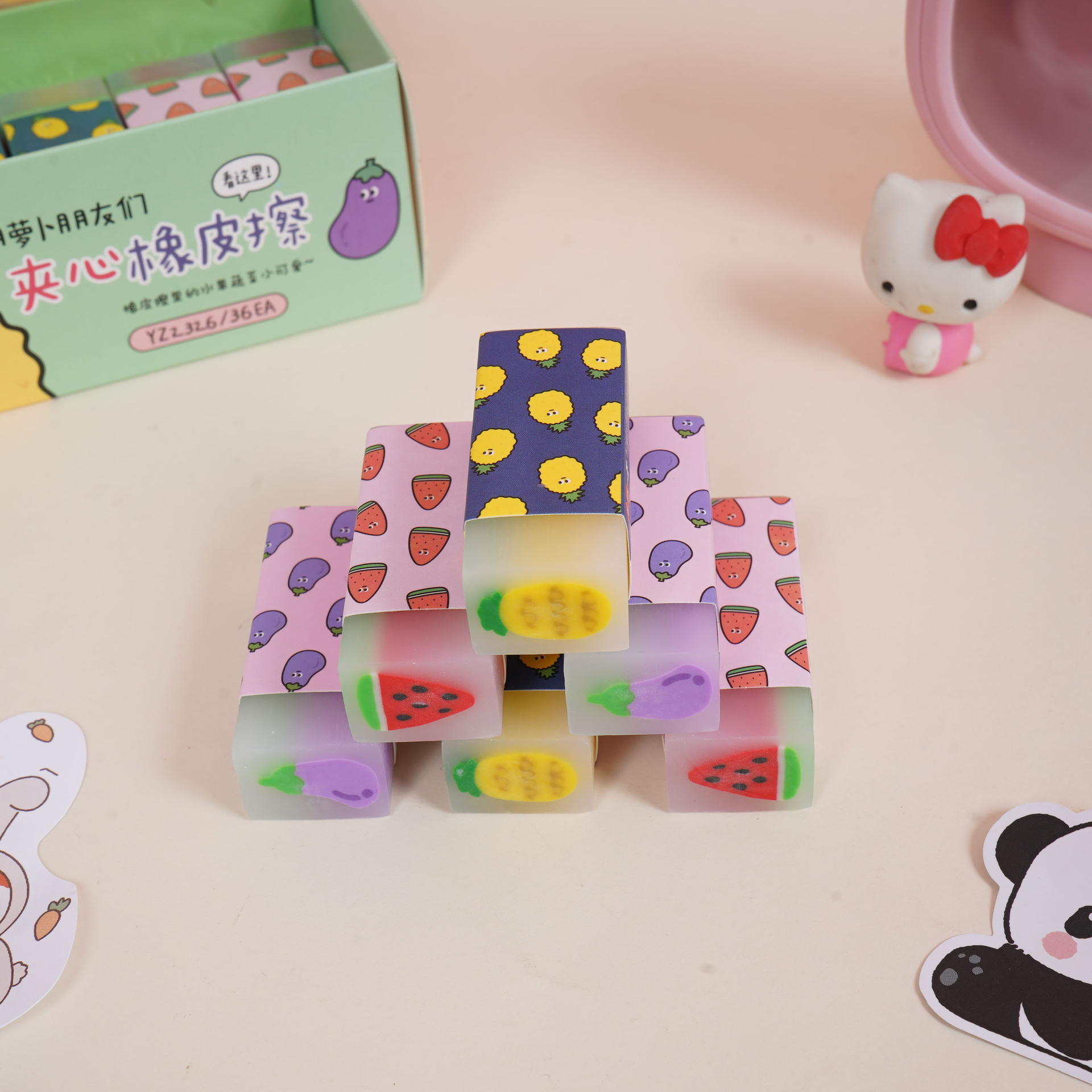 正規の果物と野菜のサンドイッチの消しゴムは漫画のパイナップルのスイカを拭きます。
