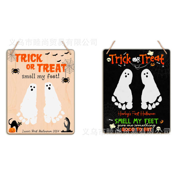 赤ちゃんの最初のハロウィーンの足跡DIY木製の看板は、砂糖を与えないと私の足の装飾カードをかぐ
