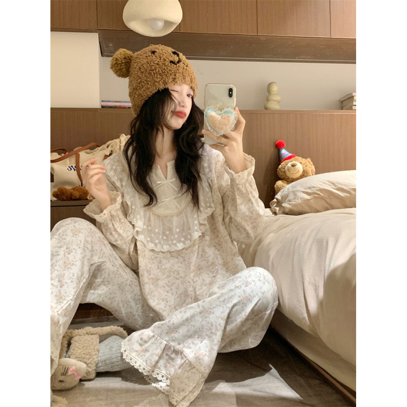 2025レースvネックの甘い花のゆるい春の家庭服パジャマセット