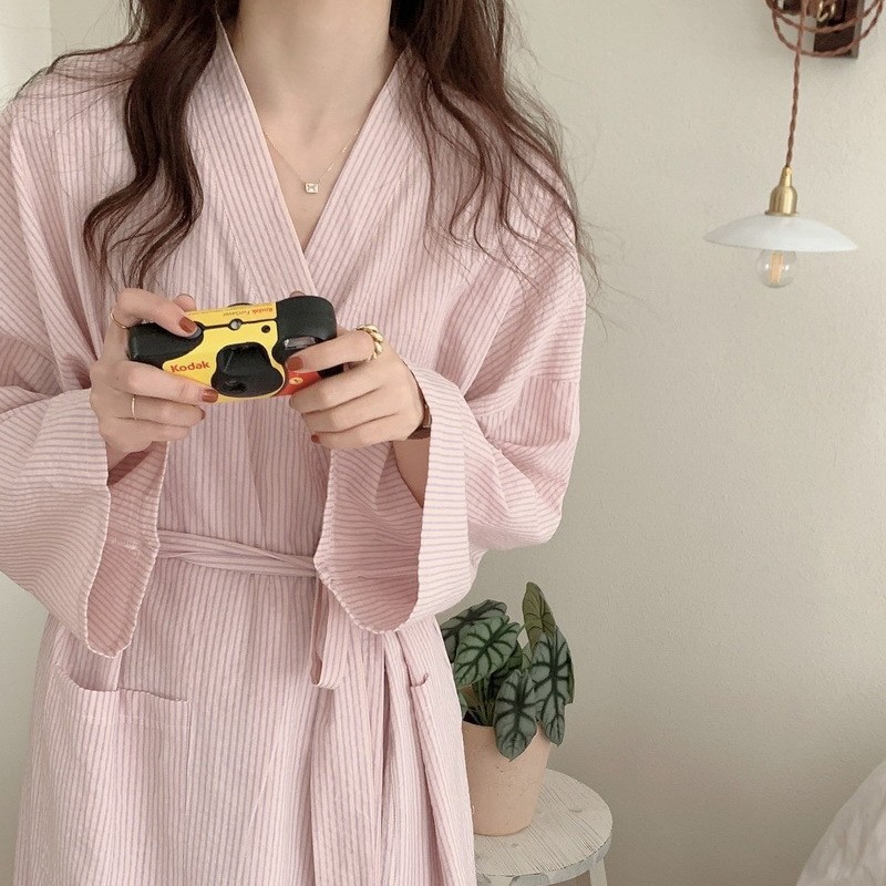 韓国の2024春の新型のストライプの寝衣の家の服の通気性のゆったりしているベルトの長いタイプのバスローブ