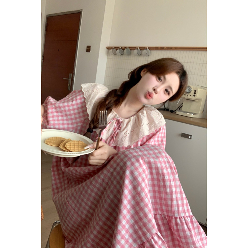 韓国版の甘い王女の風の重工のレースの綿の格子の長いスカートの家庭服のパジャマのスカート