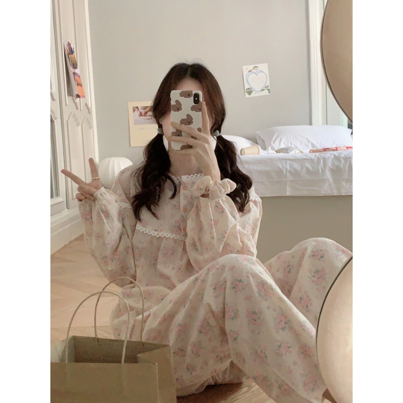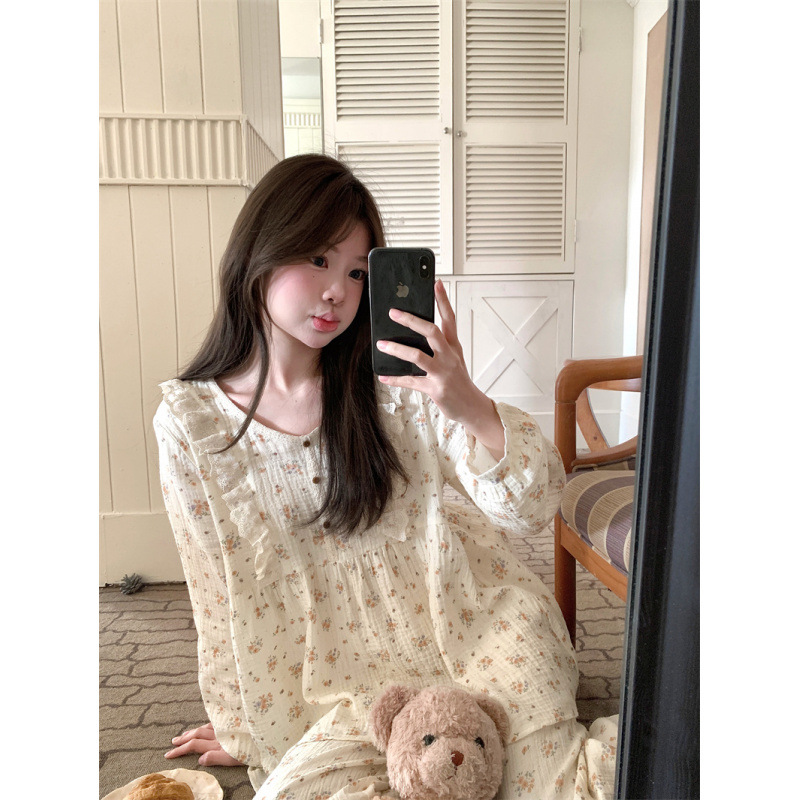 2024韓国版ins甘美な花のパジャマレースの丸首のゆったりとしたパジャマの家の服はシュシュを持っています。