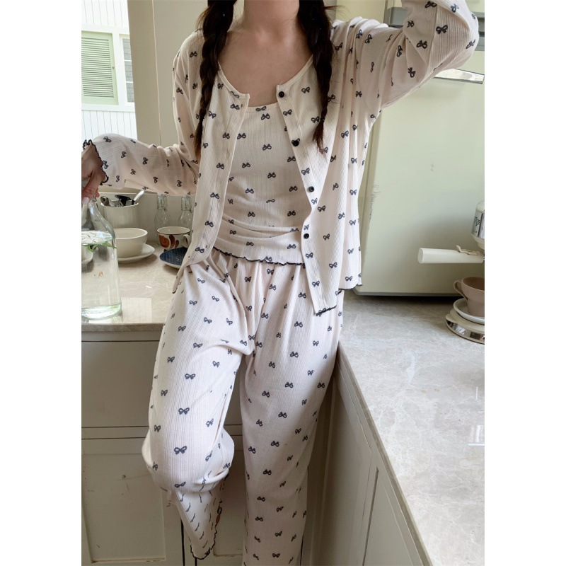 韓国INS春秋甘美蝶結び肌ニット三点セットホームウェアパジャマセット