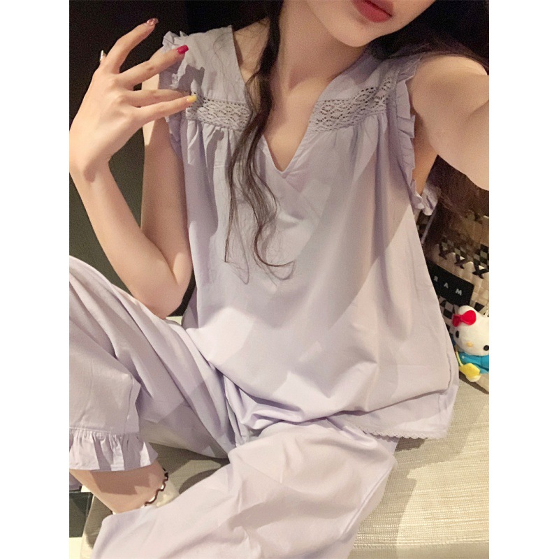 フランス独特の細部はロマンチックなvネックレースの袖なしベスト/綿のズボンのパジャマの部屋の服のスーツでいっぱいです。