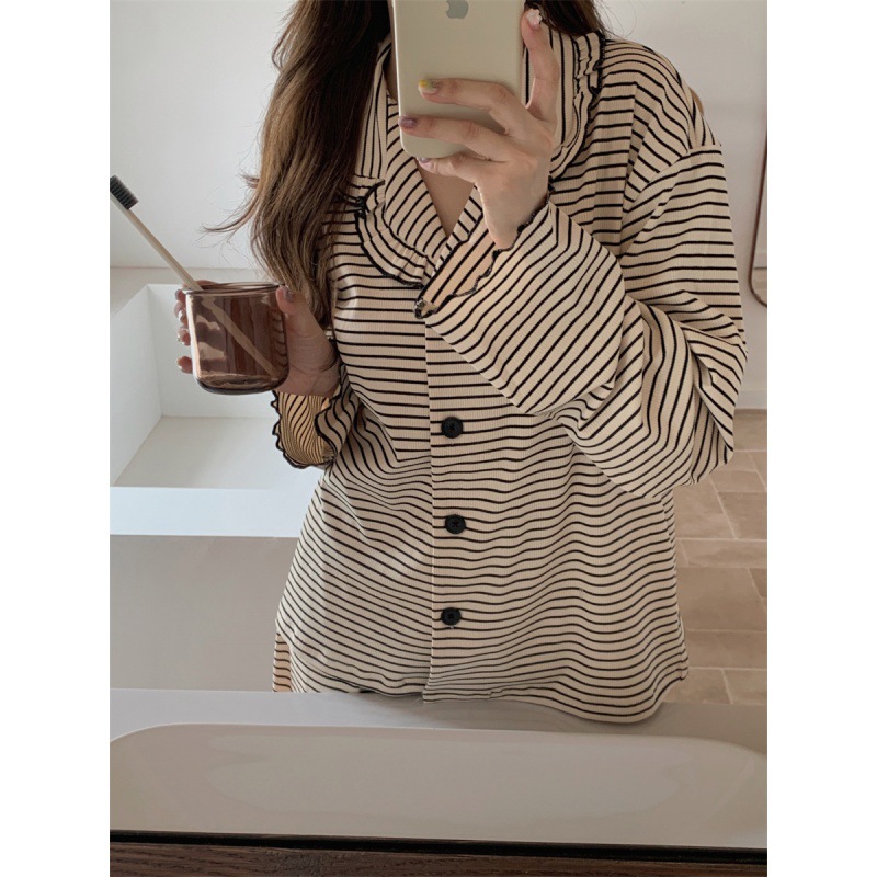 実拍韓国版ストライプシンプルinsネット赤パジャマ長袖女性ゆったりカジュアルホームウェア秋新作