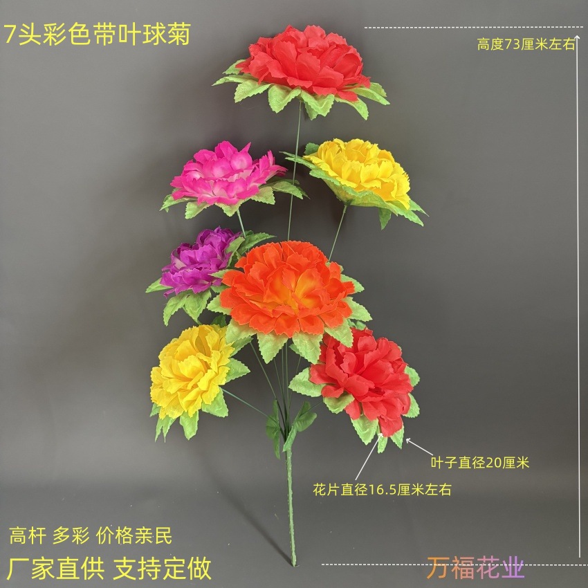 7頭の葉付きの球菊の高い竿の清明は花のプラスチックの絹の花を祭って葬祭を祭って墓の上のお墓を掃くための造花を卸売りします。