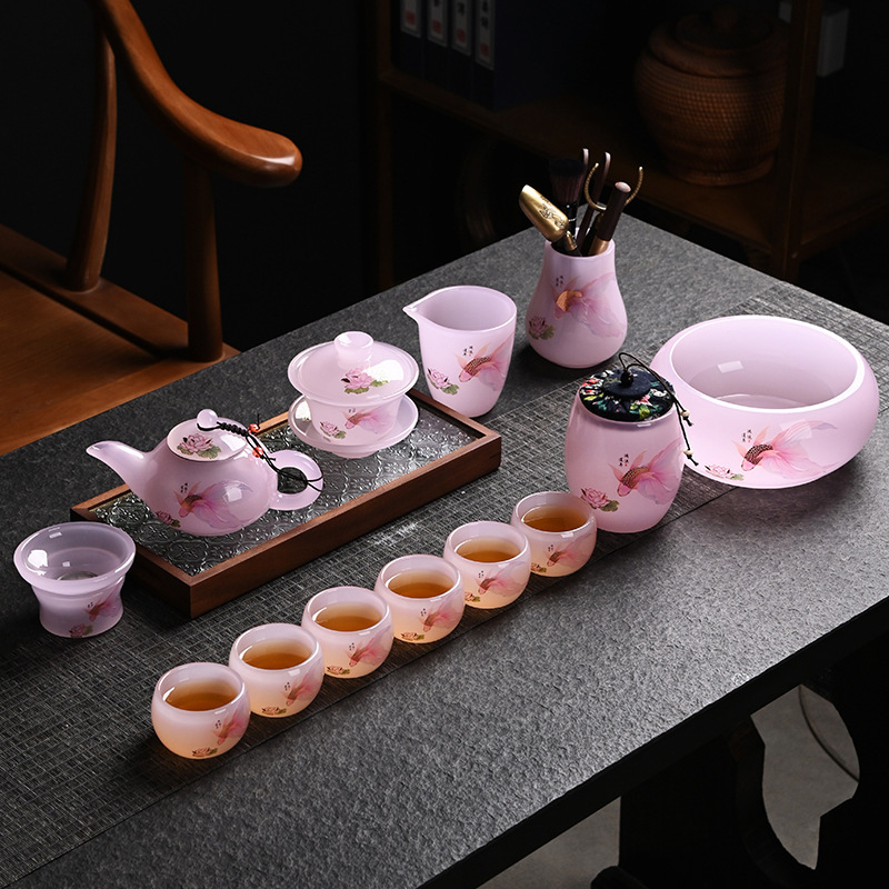 ピンク瑠璃玉磁器セット家庭用工夫茶器ガラス玉三才蓋碗凍結焼ギフトボックス