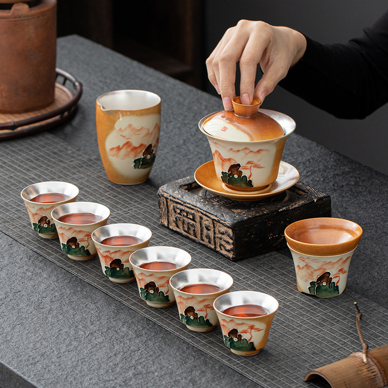 新型茶器セット軽豪華陶磁器エナメル彩999純銀蓋碗茶杯年会ビジネスプレゼント