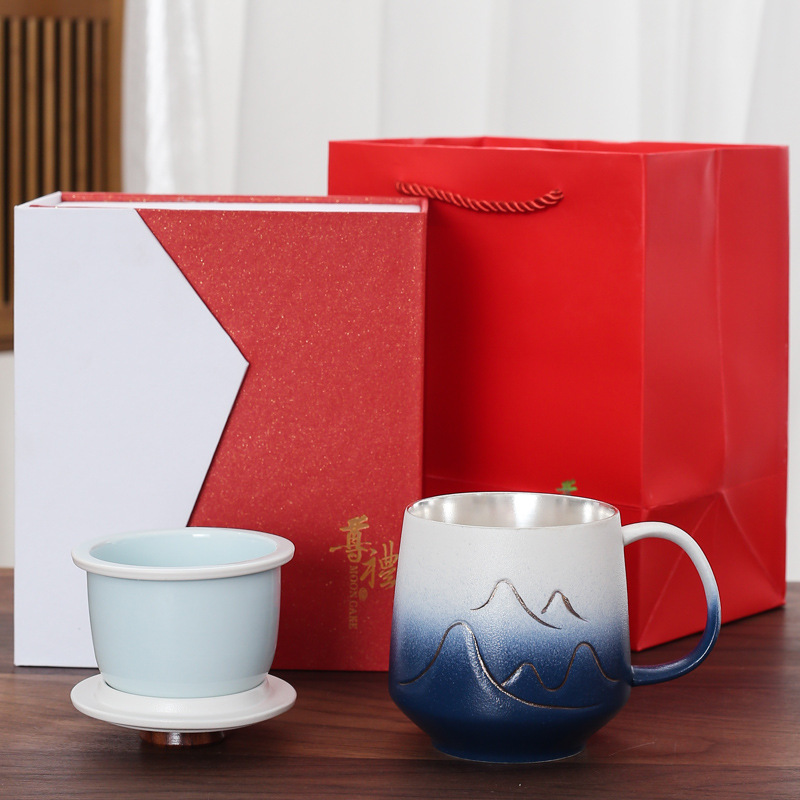 手作りの高さの銀の創意的な陶磁器のマグカップのギフトボックスの999銀メッキの事務カップは蓋のお茶を持ってお茶のカップを分離します。