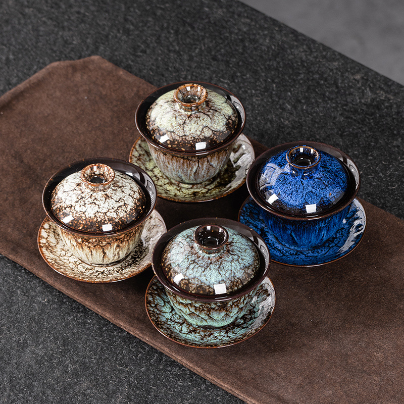 新商品天目釉薬窯変三才蓋碗鈞磁器万彩建杯品茶碗工夫茶器曜変大蓋碗