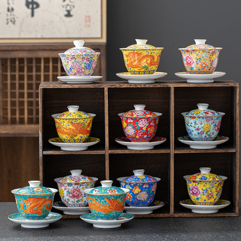 宮廷風エナメル彩糸蓋陶磁器工夫茶道具復古三才敬茶わん手掻花茶わん杯