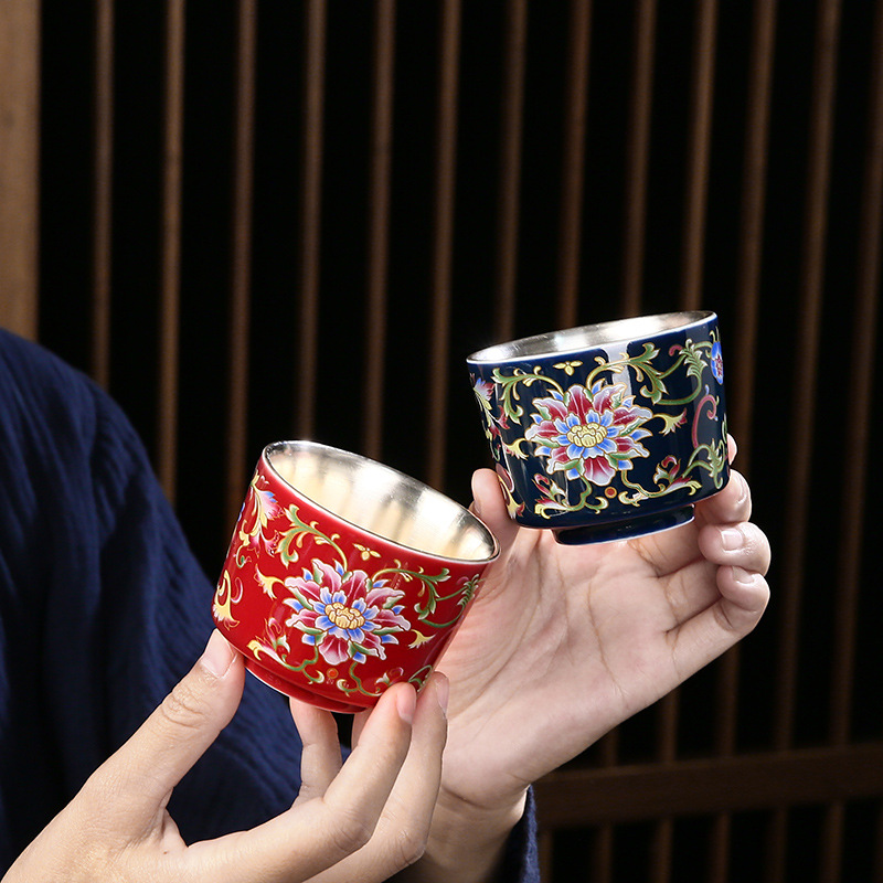 999純銀のお茶の杯の工夫のお茶の碗のエナメルの彩色の陶磁器の品茗杯の手作りの純銀の主人の杯の単杯の贈り物の箱の中で