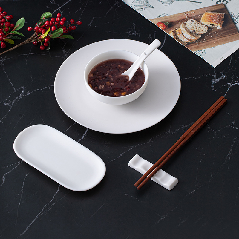 中国式ホテルには羊脂玉素焼きの高級陶磁器食器5点セットの食器とスプーンと箸の棚の純色セットがあります。