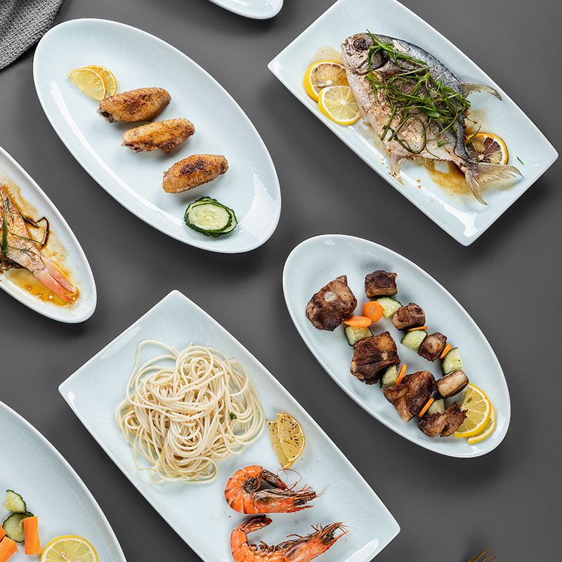 新型レストラン陶磁器蒸し魚皿天青釉長方形皿ホテル料理館焼肉海鮮皿