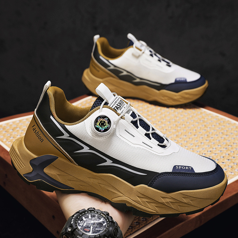 男性運動靴取取件2024新型回転ボタン屋外滑り止め厚い底学生ランニングお父さん靴潮靴