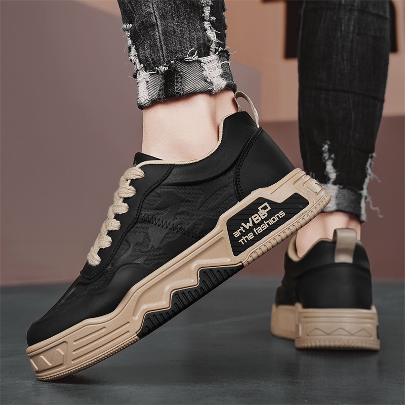 男性靴2024新型秋の黒カジュアル靴英倫風男運動厚い底皮面復古黒板靴