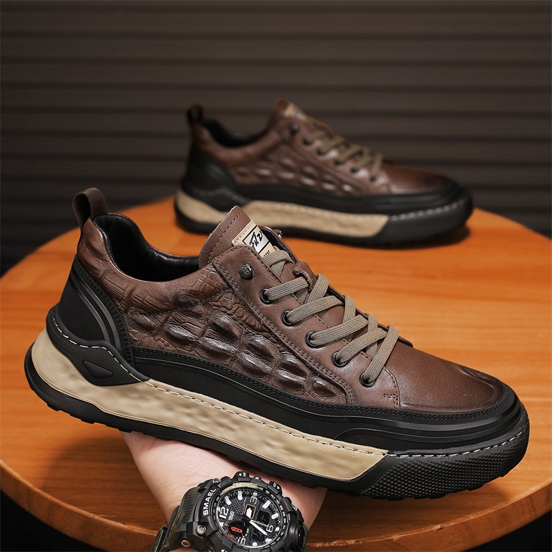 男性靴2024の新しい厚い底の板の靴の韓国版のワニの紋様のレジャーの運動の靴の男性の足は皮の労働保護の靴を踏んでいます。