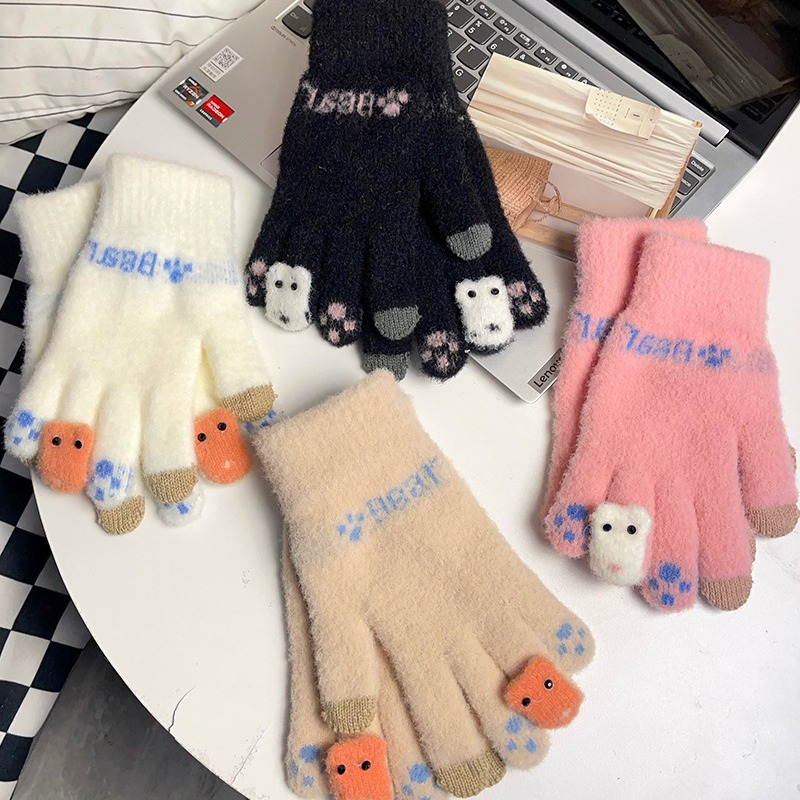 冬の保温手袋の漫画の指の熊のかわいい手袋の女性のメリヤスとベルベットの指の手袋は手袋の卸売りに乗ります。