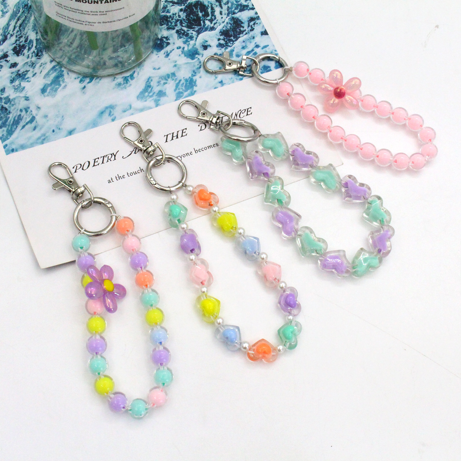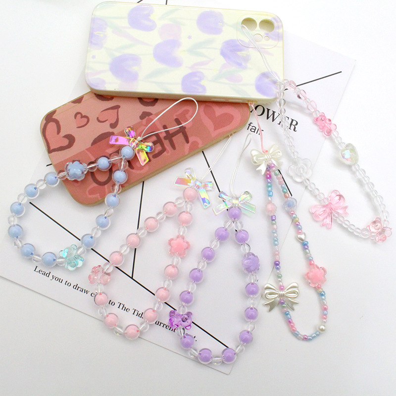 新しいキャンディー色のビーズの熊の花の携帯電話のチェーンの手作りのdiyの短い携帯電話の携帯電話の鎖のアクリルのひも