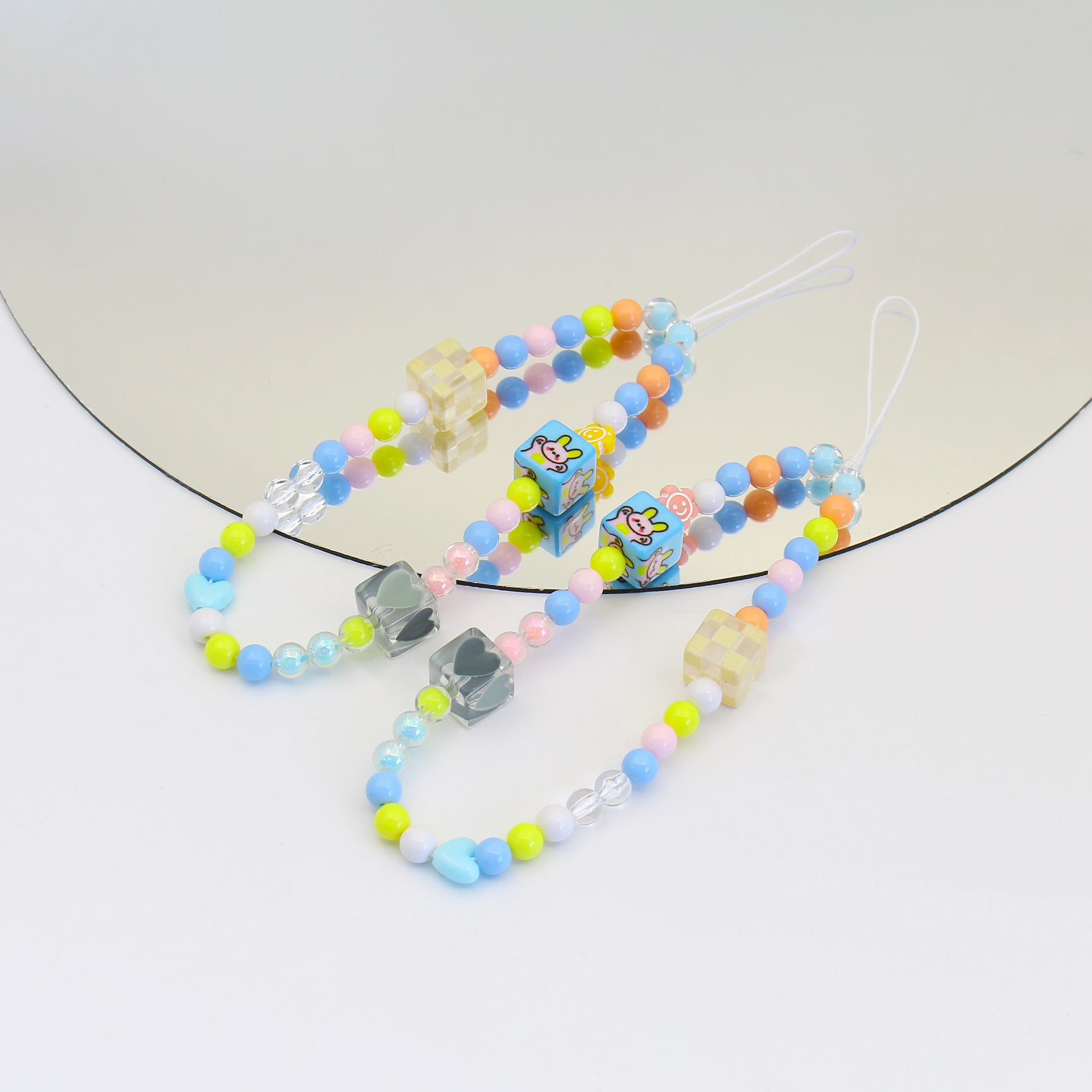新商品のキャンディー色の漫画の四角の携帯電話のチェーンの数珠の携帯電話の縄は四角の格子を飾って携帯電話のチェーンを落とさないでください。