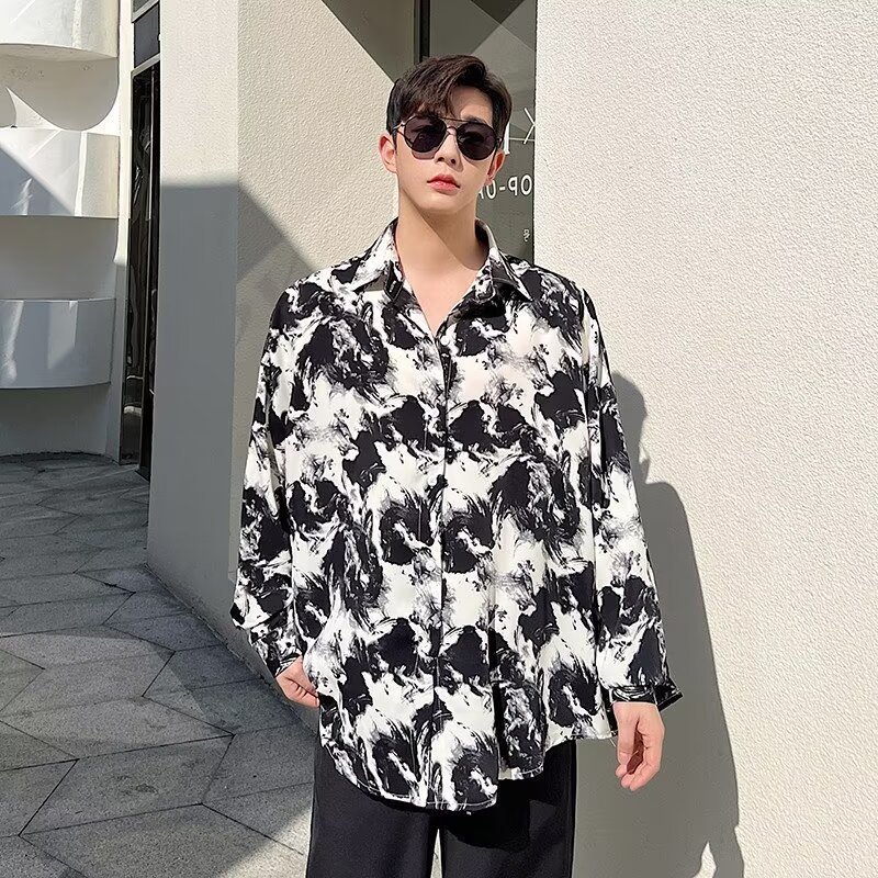花のシャツの水墨は垂れ下がった感じの長袖の男性の韓国版の潮流を染めます。