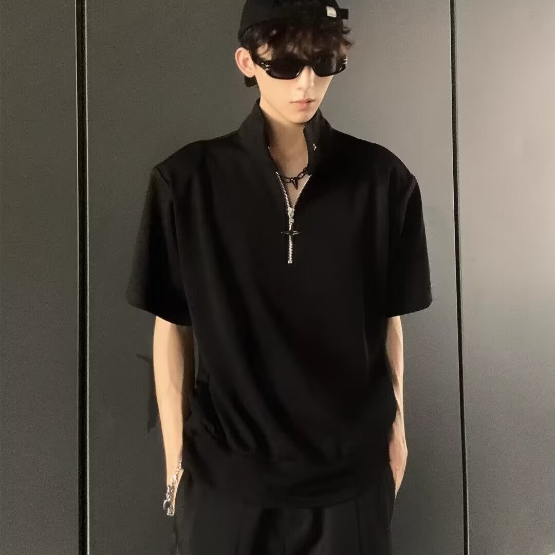 Tシャツ男性半袖ファッション百合半ファスナーpoloシャツ男性2024夏新作ワッフル男性