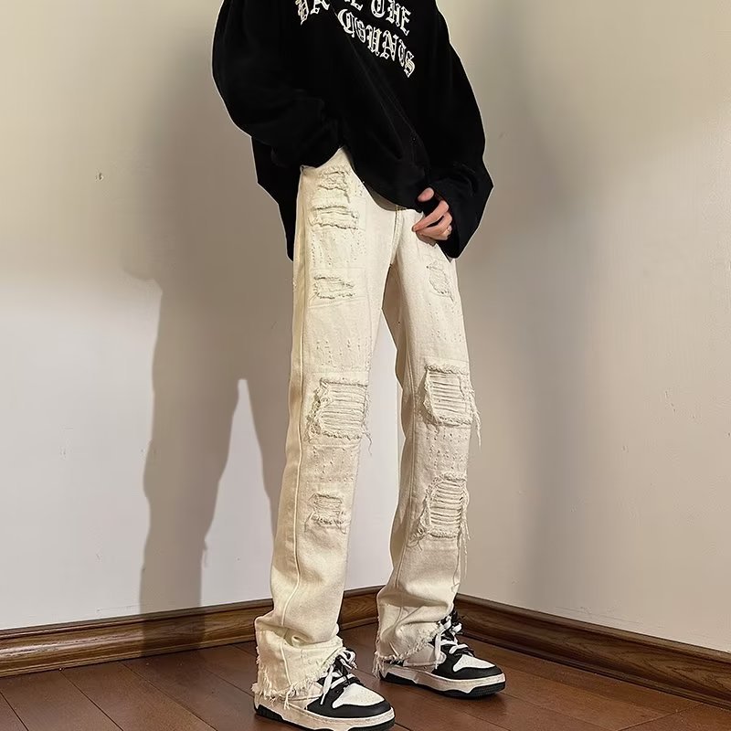 デザイン感が破れたジーンズ男性のゆるいストレートブランドins水洗いレトロなアメリカのワイドパンツ
