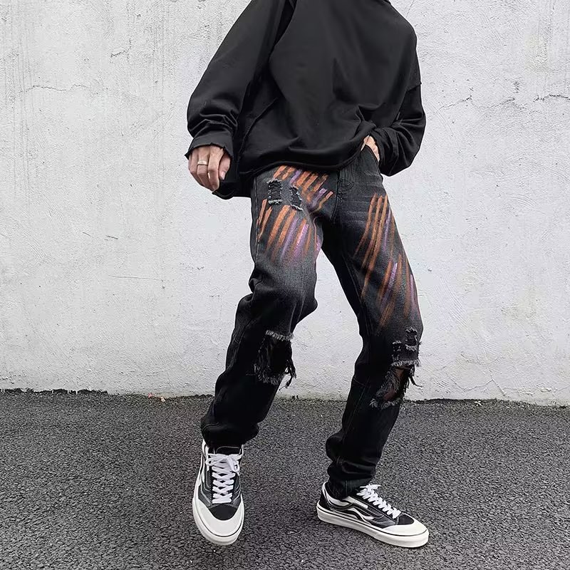 穴が開いた毛並みのデニムのアメリカ式vibeズボンの男性insの潮の百合の水洗いのズボンの男性の修身の小さいラッパのズボン
