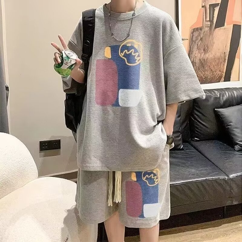 スーツ2024半袖半ズボンワッフル香港風男子運動レジャーセット上着ズボンゆるいレジャーブーム