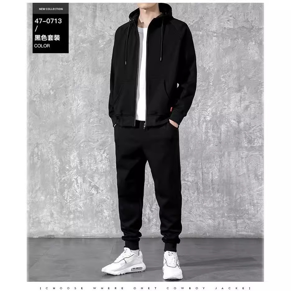 メンズ春と秋のフード付きスポーツウェア秋の黒のセットとかっこいいカジュアルコートinファッションブランド
