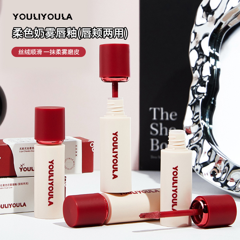 ユリユラの柔らかい色の乳の霧の唇の釉薬のベルベットの滑らかな唇の頬の両用のすっぴんの白い雰囲気感のチークの口紅