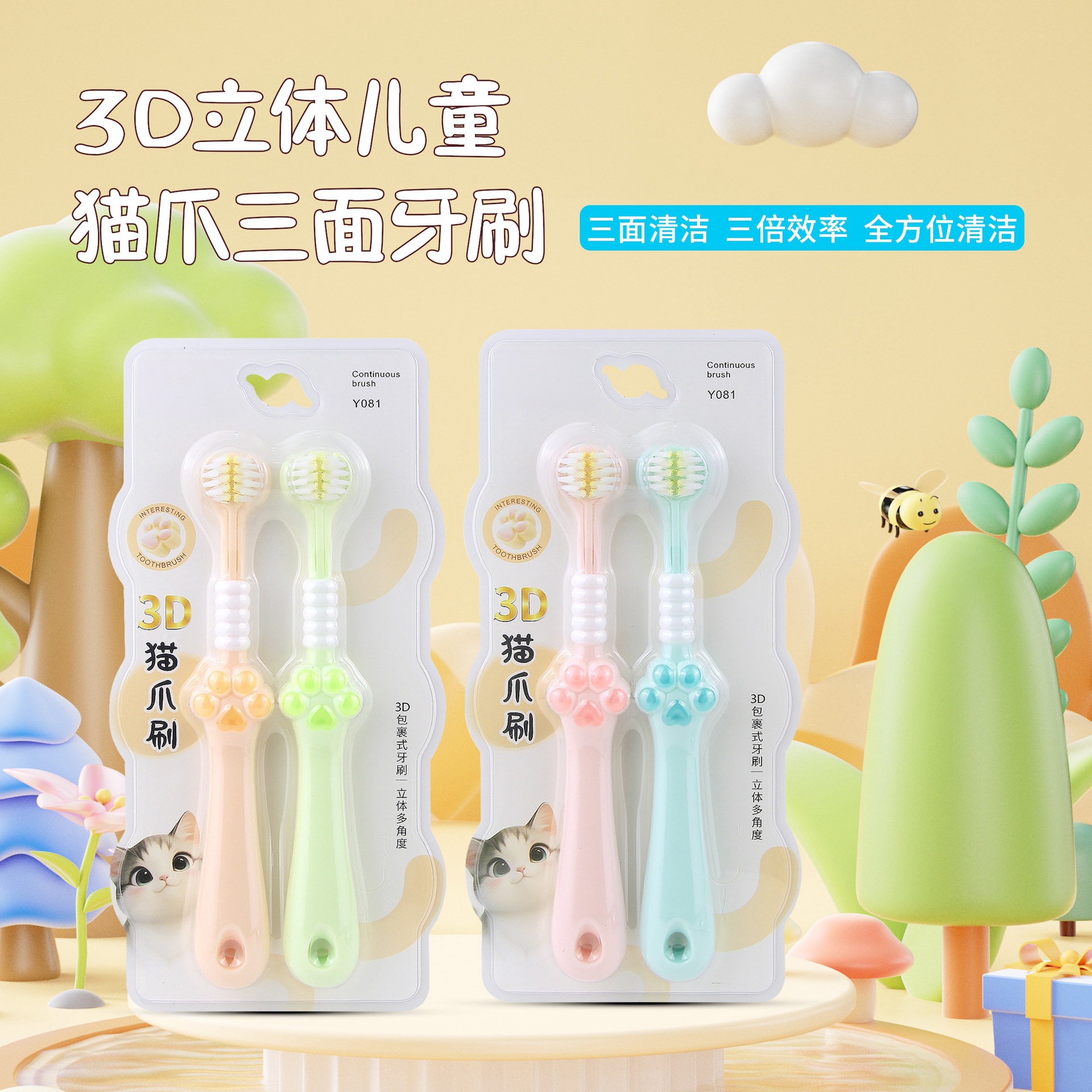 猫の爪の子供の3面の歯ブラシの柔らかい毛の家庭用3-12歳の柔らかい細い毛の3面の歯ブラシの高級な家庭用u型
